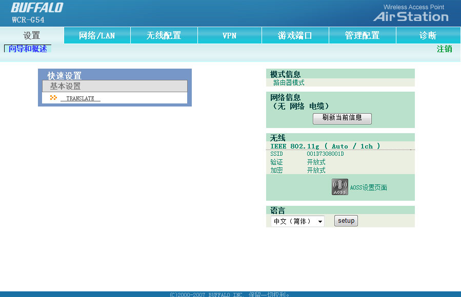 Buffalo WCR-G54无线宽带路提供了简体中文、繁体中文和英文三种界面